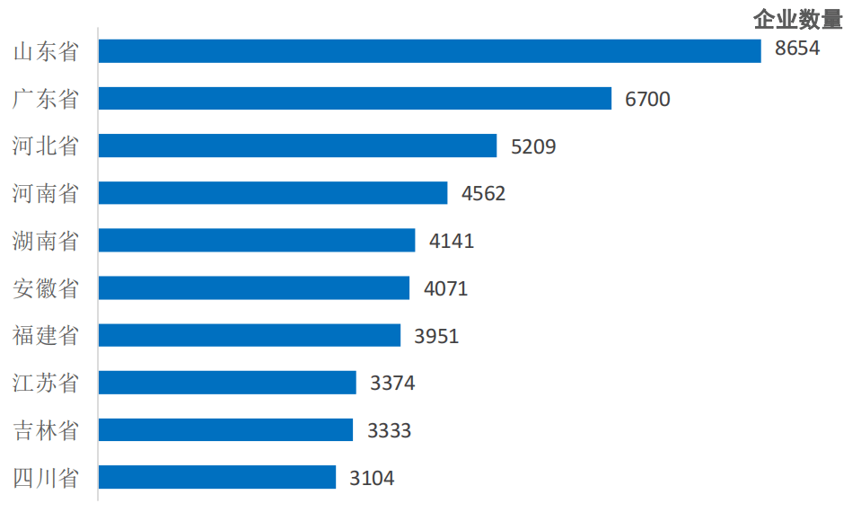 通过梳理头部企业所属地域发觉, 广东省位居榜首,企业数量高达21家;其次是上海、山东和浙江,企业数量均大于或等于10家;福建、、湖南、江苏、河南各有跨越5家企业。