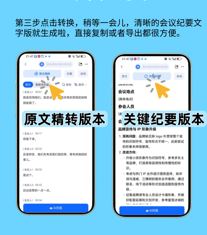 现正在我用它的流程出格顺:先传录音,选“会议纪要”模式,等个几分钟(视录音长度),就能拿到带措辞人标注的 transcript、摘要和环节词。我会先看摘要,有没有漏掉新整改办法,如果没写,间接去 transcript 里找对应的措辞人部门,快得很。然后把环节词拾掇一下,好比“原料农残”“出产流程优化”,这些都是纪要要凸起的。最初查抄术语,确认没问题,一份完整的纪要就搞定了。伴侣他们之前拾掇一次纪要要俩⼈一天,现正在一小我俩小时就够,时间省了75%不说,错误率还降了九成。好比前次会议有个从管说“冷链运输要加测温度记实”,之前人工转成“冷鲜运输”,仍是带领查抄才发觉;用听脑AI间接标对了“冷链运输”,压根不消回头改。还有一次会议俩小时,人工拾掇得翻三遍录音,用它十分钟就出了摘要,沉点全正在里面。